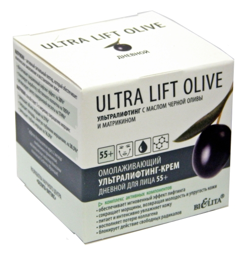 БЕЛИТА ULTRA LIFT OLIVE КРЕМ ДНЕВНОЙ ДЛЯ ЛИЦА 55+ ОМОЛАЖИВАЮЩИЙ УЛЬТРАЛИФТИНГ 50млОписание: Дневной омолаживающий ультралифтинг-крем разработан с учетом возрастных особенностей кожи женщин старше 55 лет. Комплекс активных компонентов воздействует на возрастные изменения зрелой кожи, обеспечивая омолаживающий уход: обеспечивает мгновенный эффект лифтинга, сокращает морщины, возвращая молодость и упругость кожи; питает и интенсивно увлажняет кожу, восполняет потерю коллагена. Действие активных компонентов: Hyalusphere PF - высокомолекулярная гиалуроновая кислота направленного действия, проникает в глубокие слои кожи и обеспечивает видимый эффект подтяжки и заполнения морщин путем выталкивания их изнутри. Tens up™ - обеспечивает выраженный лифтинг-эффект, оказывает длительное антивозрастное действие на кожу за счет стимулирования синтеза коллагена. Масло черной оливы обеспечивает полноценное питание и длительное увлажнение кожи, придавая ей обновленный, свежий и сияющий вид, защищает кожу от воздействия солнечных лучей, предотвращая её фотостарение. Мощное антиоксидантное действие масла черной оливы предупреждает повреждение кожи свободными радикалами. Матрикин - один из самых эффективных пептидов, который борется с возрастными изменениями кожи, активизирует выработку гиалуроновой кислоты и коллагена, разглаживает морщины и обеспечивает эффект лифтинга. Cocтав: Aqua (Water), Sorbitan Stearate, Methyl Glucose Sesquistearate, Disopropyl Adipate, Isopropyl Myristate, Glycerin, Cetearyl Alcohol, Hyoroxypropyl Cyclodextrin, Palmitoyl Tripeptide-38, Caprylyl Метhicone, Dimeticone/Vinyl Dimeticone Crosspolymer, Silica, Butylene Glycol, Ppg-15 Stearyl Ether, Theobroma Cacao (Cocoa) Seed Butter, Cichorium Intybus (Chicory) Root Oligosaccharides, Caesalpinia Spinosa Gum, Gluconolactone, Sucrose Palmitate, Tocopheryl Acetате, Glyceryl Linoleate, Sodium Hyaluronate, Squalane, Bis-Peg-18 Methyl Ether Dimethyl Silane, Ceteareth-25, Cyclopentasiloxane, Dimethcone Crosspolymer, Olea Europaea (Olive) Fruit Oil, Hydroxyethyl Acrylate/Sodium Acryloyldimethyl Taurate Copolymer, Methylparaben, Triticum Vulgare (Wheat) Germ Oil, Bht, Allantoin, Parfum (Fragrance), Propylparaben, 2-Bromo-2-Nitropropane-1,3-Diol. Применение: утром нанесите ультралифтинг-крем по массажным линиям на чистую кожу лица. Внимание: активная формула - возможно пощипывание. Белита_Ultra-lift-olive Характеристики БЕЛИТА ULTRA LIFT OLIVE КРЕМ ДНЕВНОЙ ДЛЯ ЛИЦА 55+ ОМОЛАЖИВАЮЩИЙ УЛЬТРАЛИФТИНГ 50мл